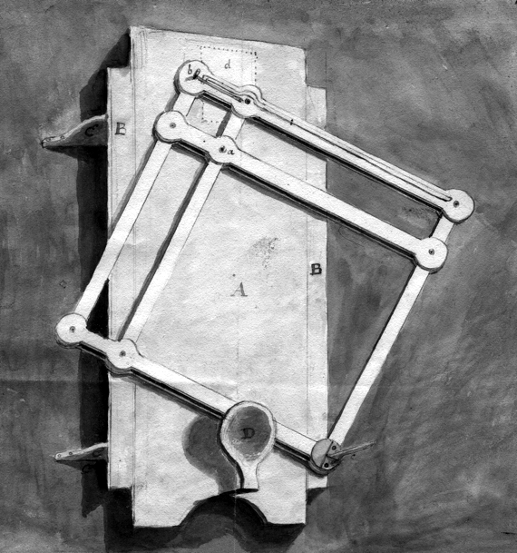 A physiognotrace is an instrument, designed to trace a person's physiognomy to make semi-automated portrait aquatints. Invented in France in 1783–1784, it was popular for some decades. The sitter climbed into a wooden frame (1.75m high x 0.65m wide), sat and turned to the side to pose. A pantograph connected to a pencil produced within a few minutes a "grand trait", a contour line on a piece of paper. With the help of a second scaling-down pantograph, the basic features of the portrait were transferred from the sheet in the form of dotted lines to a copper plate, which had previously been prepared with a ground for etching. One week later, the sitter received an etched plate and twelve little prints. The device but also the aquatint prints are called physionotraces [sic - ed].