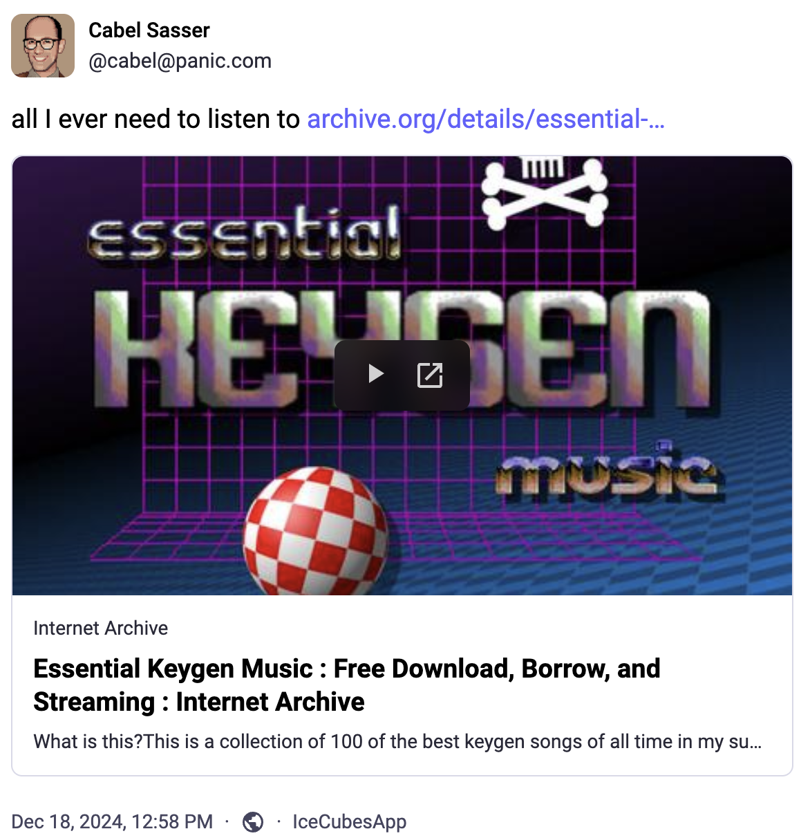 I have to confess, I spent a lot of time on the internet in the mid-to-late '90s, but I didn't manage to poke into every single dark corner. Fortunately, it's never too late to experience something new, like a 100 song playlist of the best keygen music ever written. "Keygen Music" is, of course, music composed by sketchy hacker outlaws in the '90s to brand their illicit software built to circumvent copy protection on games and software. Anyway, my favorite track is “portello - motherchip”.