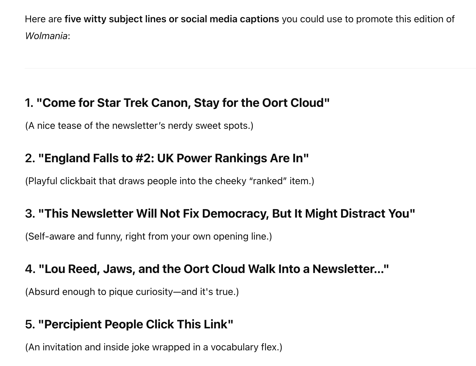 Welcome back to Wolmania. It's been a shaky week for American democracy, and peace in the middle east, and lots of other important topics. This newsletter will not, unfortunately, help with any of that, but the show must go on. Well actually the show need not go on, but I'm going to stick with it anyway.