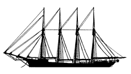 Coastal Schooner, the work horse of our coastal trade. She was probably not much more than a hundred tons, and carried everything from timber and coal to bricks, general cargo, and a load of hay to offshore island communities. Our schooner is shown with only a main topmast, but many also carried a fore topmast. Note the yawl boat towing astern.
